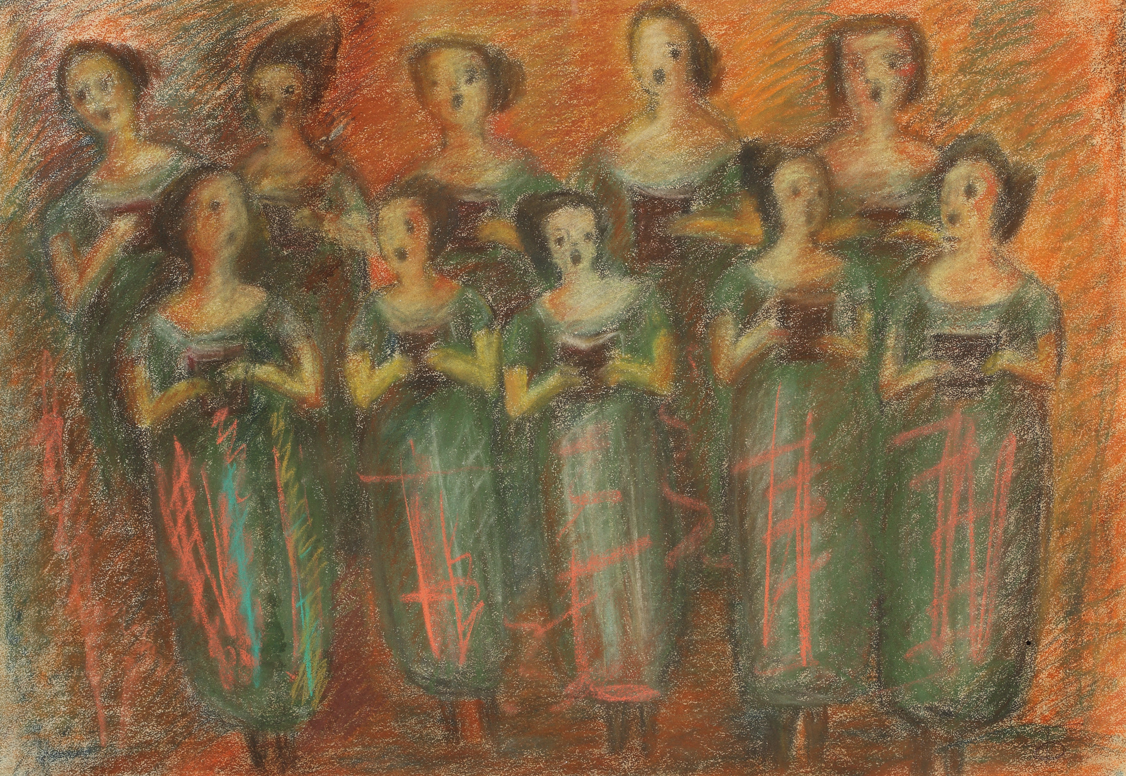 В последние годы еще появилась у Феликса тема поющего хора. И в живописи, и в мозаике эта тема есть. Вот, кстати, расскажу, чему меня Феликс научил. Оказывается, в мозаике есть такое понятие «посторонний камень». Вот представьте себе фон одного цвета, допустим вот церковные мозаики, у них фон чаще всего одного цвета и в него вставляется камень неожиданного, другого цвета. Он все связывает, зажигает работу. Как в фильме «Последний наряд» (американский фильм 1973 г., прим М.Ш.) - герои сидят, их лица освещают лампы. И вдруг лампы начинают качаться, и мы видит те же самые лица совсем иначе, проявляются скрытые чувства.
